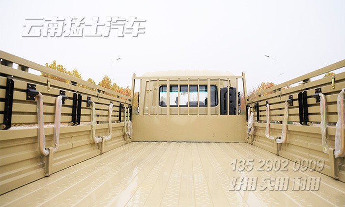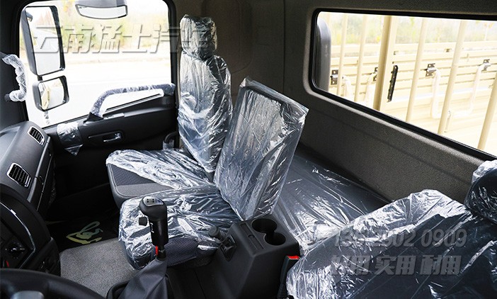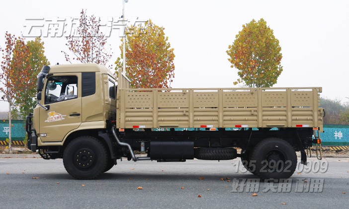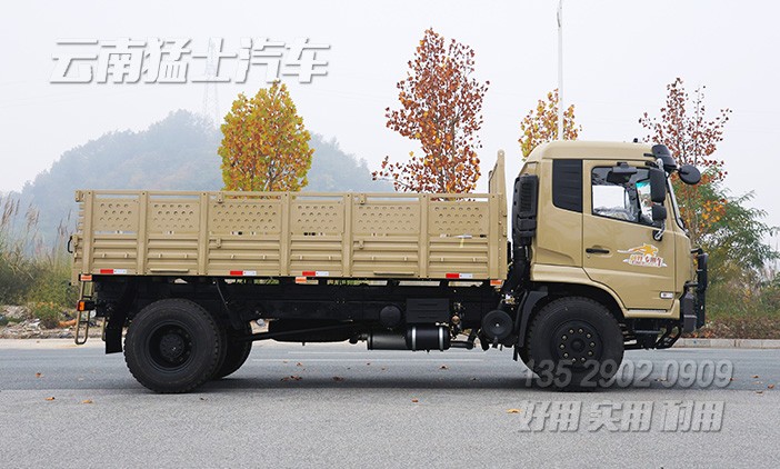 东风两轴公路运输卡车采用210马力发动机,前桥7吨后桥13吨,可承载12吨货物,货箱内带有折叠座椅,既可载货也可载人