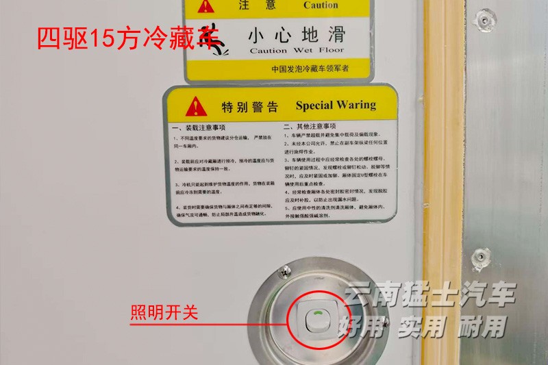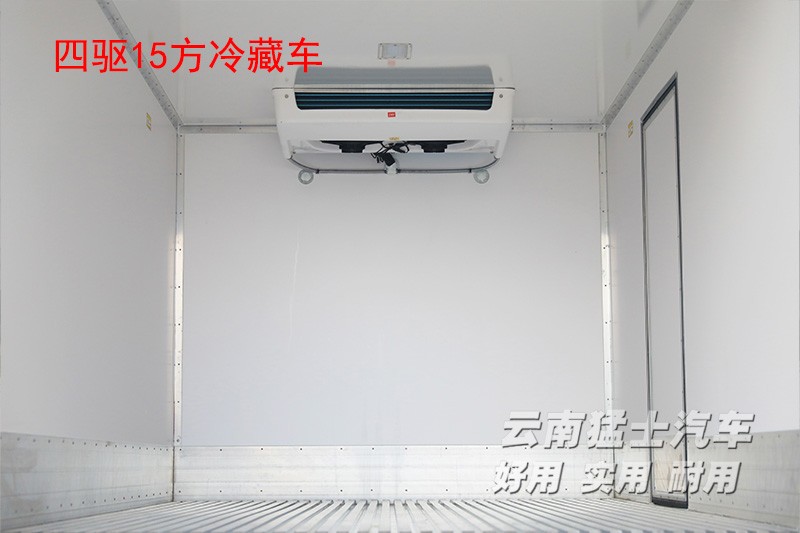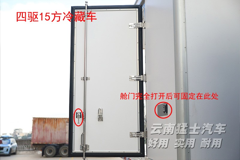 该车冷藏厢体内长3600mm宽2200mm高1900mm,采用VR食品级玻璃钢蒙皮,中间填充高密度保温泡沫,棱角处做铝合金包边处理,可容纳15方货物。装配凯达580制冷机,制冷机运行均在驾驶室内操作完成,无需下车操作。厢体右侧有一扇单开小门,采用集装箱门结构,完全打开后可固定在厢体上,从下方护栏进入厢体内部。厢体尾部为对开式集装箱门,左右可270°开启,固定在左右厢体边板。