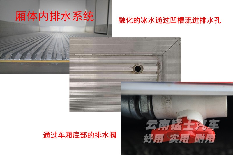 冷藏厢体内部装有一盏照明灯,地板采用了带有凹槽的铝合金花纹板,货物在装运过程中融化产生的水可顺着凹槽流进排水口,避免货物浸泡和地板结冰打滑。